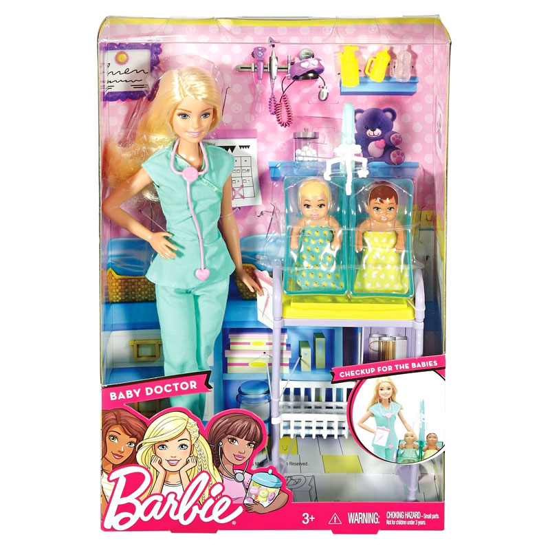 A cute baby doctor Barbie doll with 2 cute adorable baby patients and toy play pieces for examinations and caretaking.